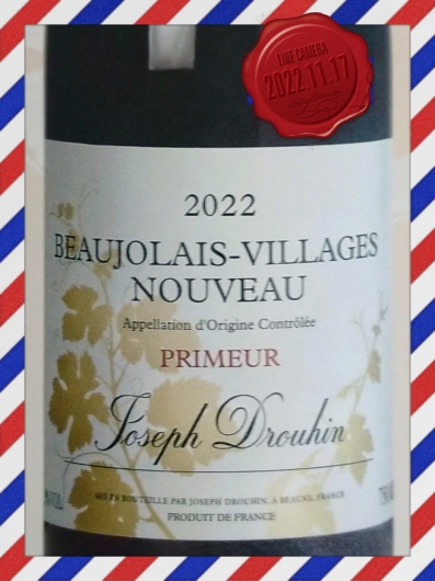 ラベルは違いますが、ANA国際線ビジネスクラスにも搭載されたブルゴーニュの名門メゾン・ジョゼフ・ドルーアン。ヌーヴォーとは新酒という意味で、毎年11月の第3木曜日に解禁されます。